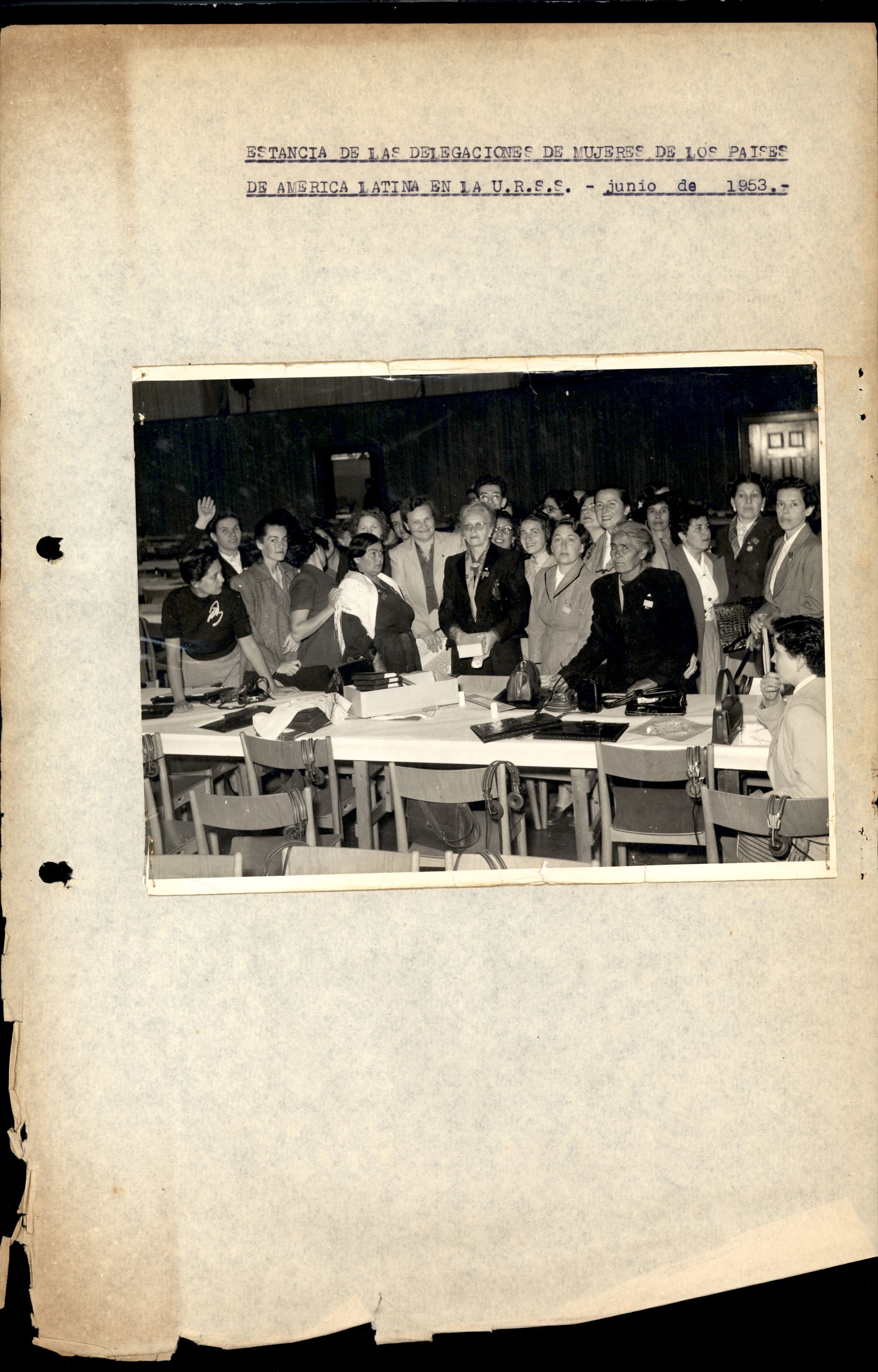 La serie fotográfica se compone de distintos registros de la estancia de delegación de mujeres de América Latina en la U.R.S.S. El registro da cuenta de visitas a instituciones escolares, de salud, de la cultura, comercios, fábricas, moda, entre otros. Todas tienen epígrafe y las delegadas argentinas que asistieron al Congreso están identifican con número y la referencia al dorso. En algunas figura como autor de las fotos E. Evserijin. La presente fotografía forma parte de una serie más amplia cuyo contexto puede consultar siguiendo este enlace: https://atom.comisionporlamemoria.net/index.php/leg-39
