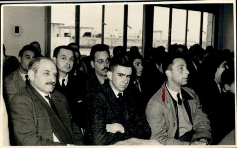 Fotografía de un grupo de asistentes. Se observa una marca identificatoria con tinta roja. En reverso: "Gluzman". La presente fotografía forma parte de una serie más amplia cuyo contexto puede consultar siguiendo este enlace: https://atom.comisionporlamemoria.net/index.php/leg-27-t2