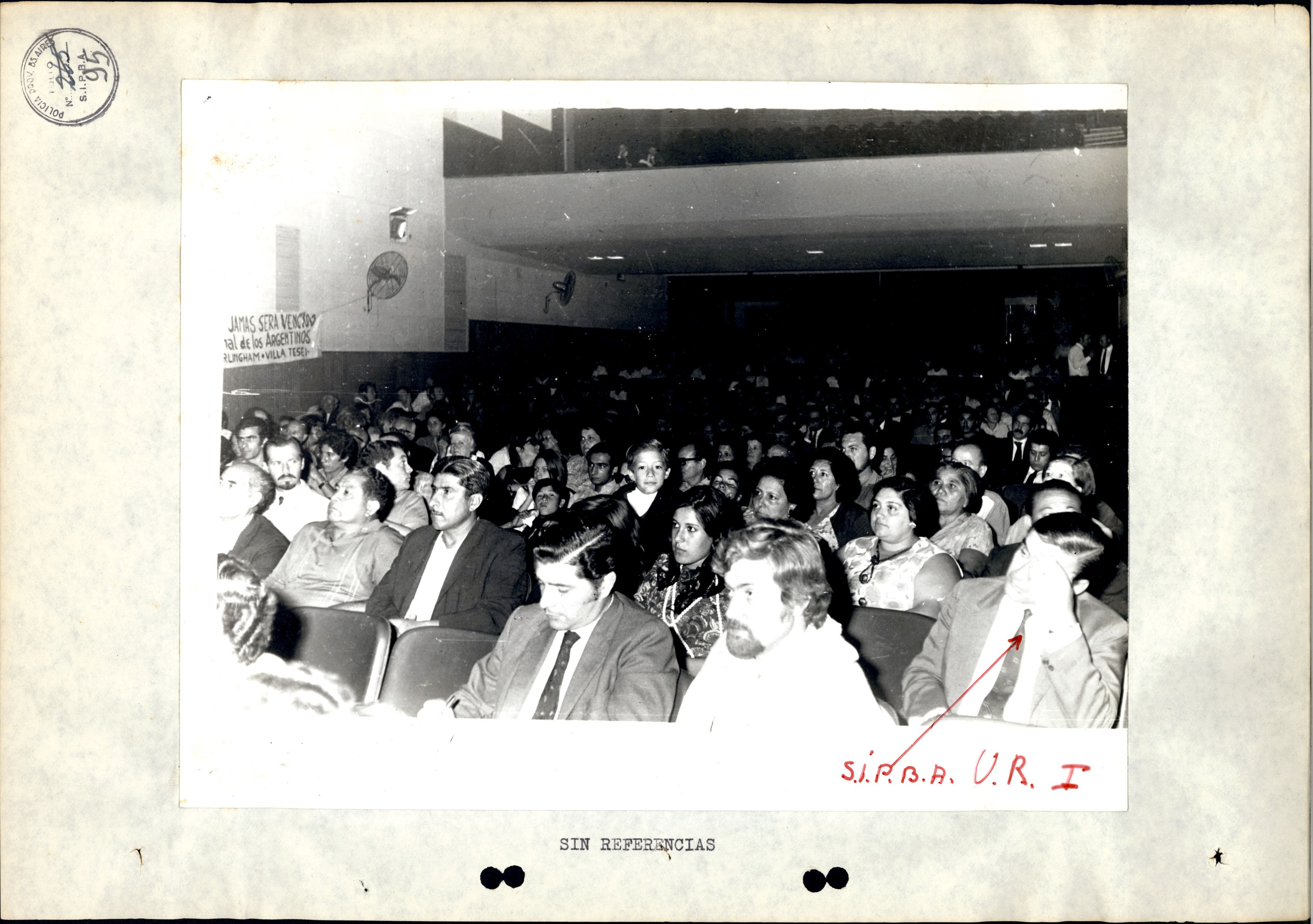 Asistentes al encuentro. En epígrafe: "Sin referencias". En tinta roja, marca identificatoria del "agente S.I.P.B.A. U.R.1". La presente fotografía forma parte de una serie más amplia cuyo contexto puede consultar siguiendo este enlace: https://atom.comisionporlamemoria.net/index.php/leg-438-2-15