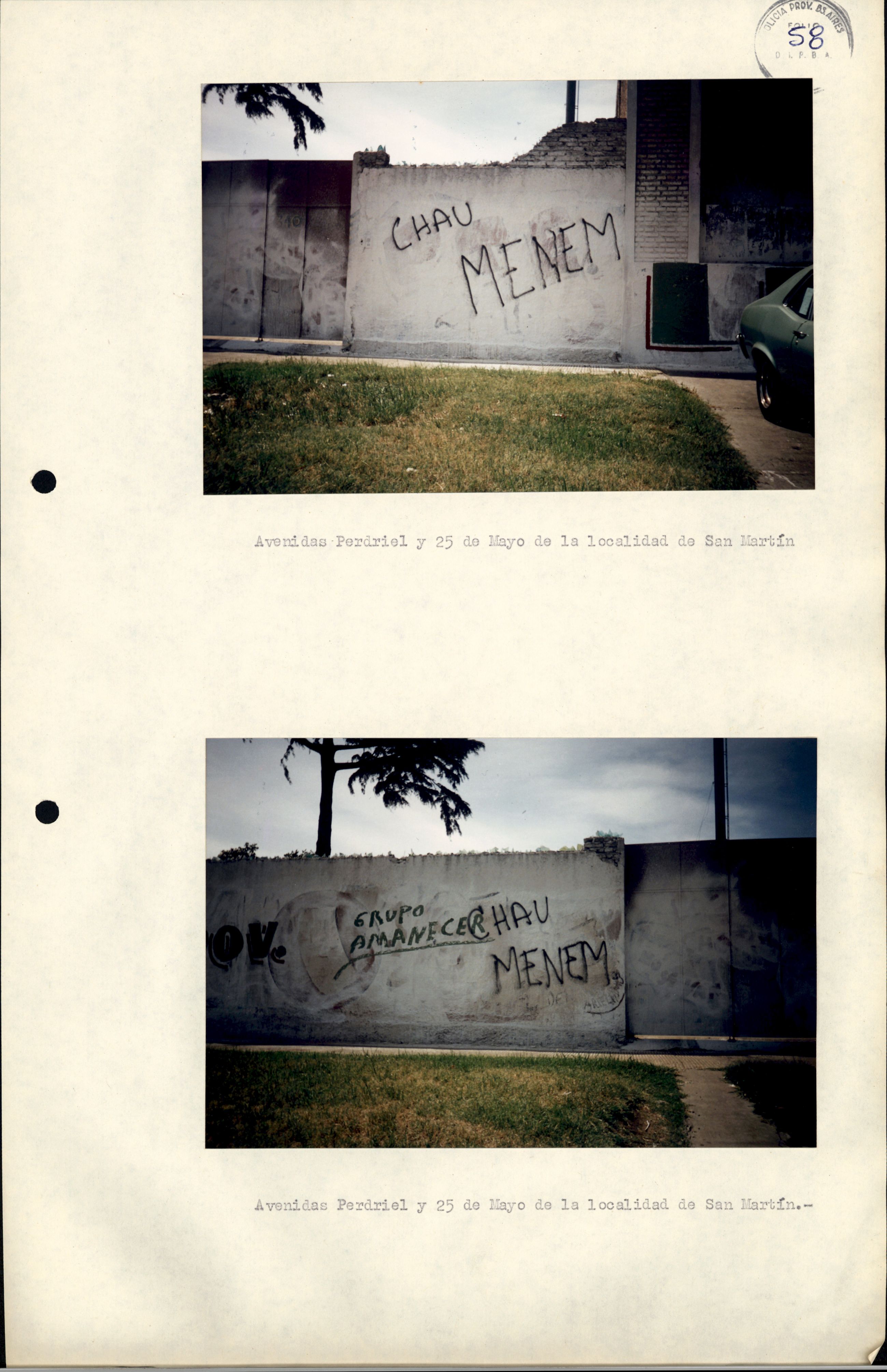 Inscripciones murales donde se lee "chau Ménem". El agrupamiento viene detrás de una carátula que indica haber sido producido por el delegado de inteligencia de San Martín.