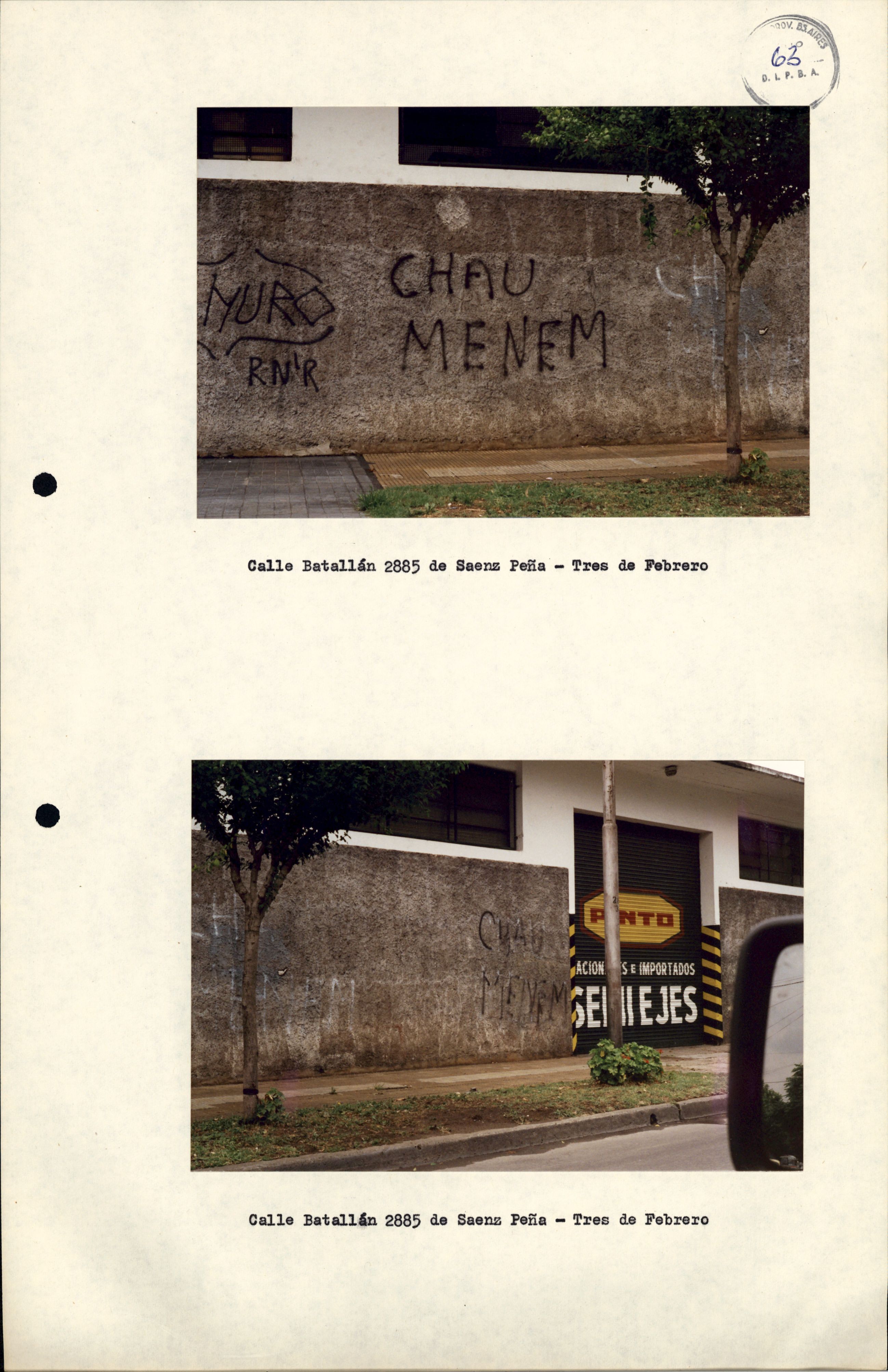 Inscripciones murales donde se lee "chau Ménem". El agrupamiento viene detrás de una carátula que indica haber sido producido por el delegado de inteligencia de San Martín.
