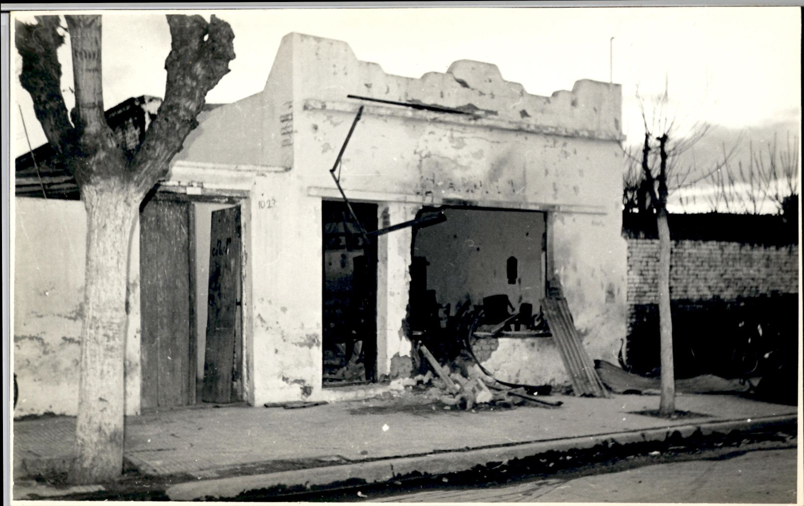 Fachada del comité desde la calle. Puerta y ventana rotas, escombros y chapas tiradas. Moto estacionada en vereda. En el interior sillas, mueble y fragmento de bandera: "Partido Comunista Mercedes". La presente fotografía forma parte de una serie más amplia cuyo contexto puede consultar siguiendo este enlace: https://atom.comisionporlamemoria.net/index.php/galv-ola-97