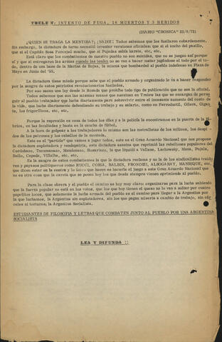 La delegación Lanús le envía a la Central de inteligencia un panfleto sobre los sucesos de Trelew que había sido distribuido en Capital Federal. El informe señala que fue obtenido confidencialmente.